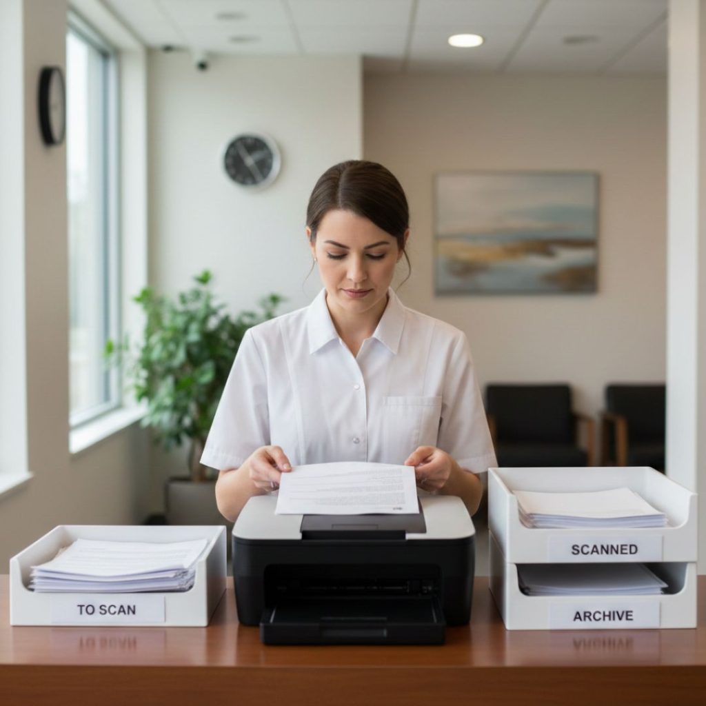 | Front desk scanning intake forms | Files saved under wrong patient profile | Structured verification workflow |